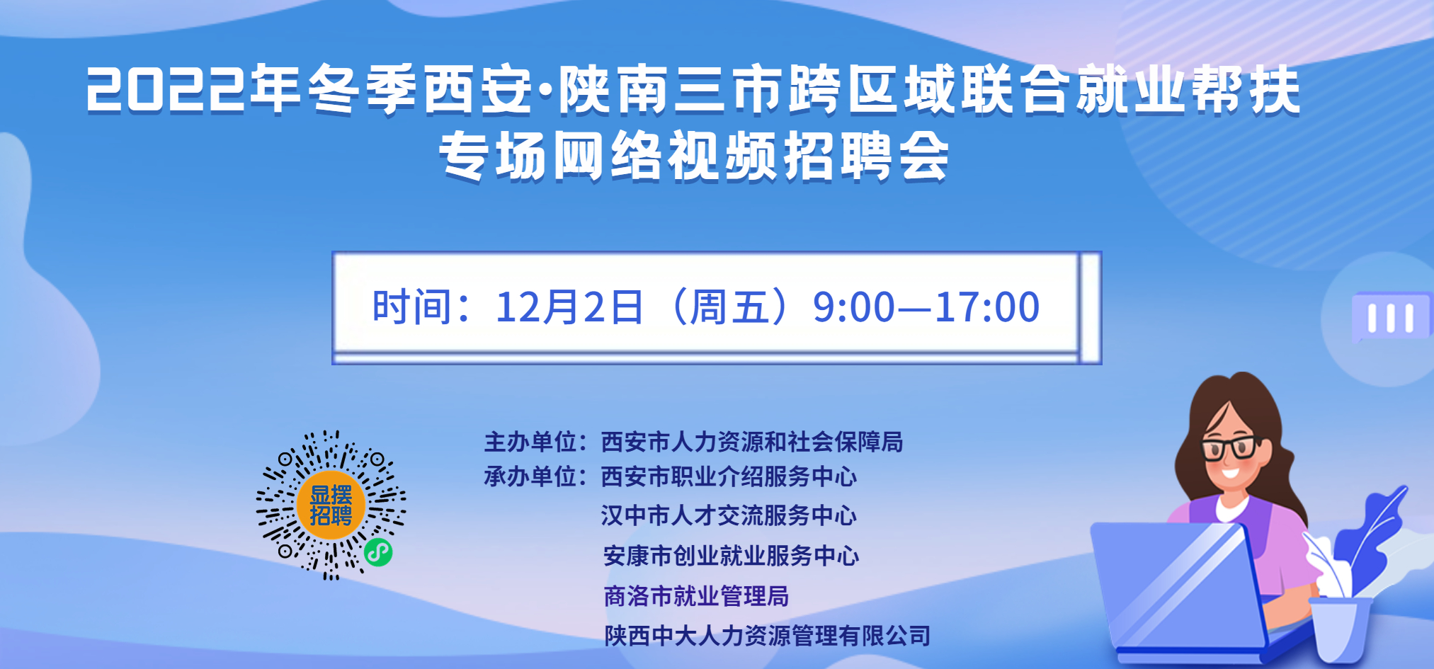 2022年12月2日,西安市職業(yè)介紹服務(wù)中心將聯(lián)合漢中市人才交流服務(wù)中心、安康市創(chuàng)業(yè)就業(yè)服務(wù)中心、商洛市就業(yè)管理局及陜西中大人力資源管理有限公司,舉辦“2022年冬季西安·陜南三市跨區(qū)域聯(lián)合就業(yè)幫扶專場(chǎng)網(wǎng)絡(luò)視頻招聘會(huì)”。招聘會(huì)報(bào)名火熱進(jìn)行中!