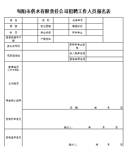 (2)應聘人員須在規(guī)定時間內(nèi)登錄報名網(wǎng)址,按要求如實、完整填寫《旬陽市供水有限責任公司工作人員報名表》(以下簡稱報名表),并上傳如下資料:①本人近期2寸免冠正面證件電子照片(jpg格式、大小30KB以下、紅底);②本人有效身份證件正、反面同頁掃描件;③戶口簿首頁及本人頁;④學歷學位證書、資格證書掃描件:包含所有大專及以上學歷畢業(yè)證書;⑤上傳從學信網(wǎng)下載的有效期內(nèi)的《教育部學歷證書電子注冊備案表》;⑥與報名崗位相關(guān)的資格證書;⑦有工作經(jīng)歷及年限的,需在報名表中如實填報工作履歷。